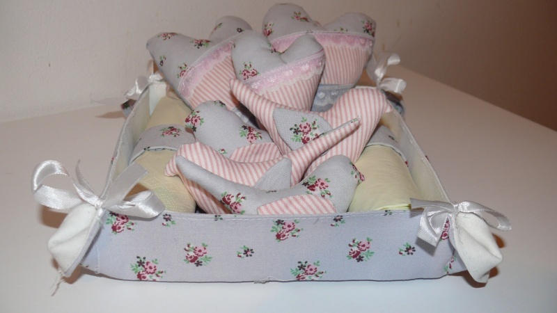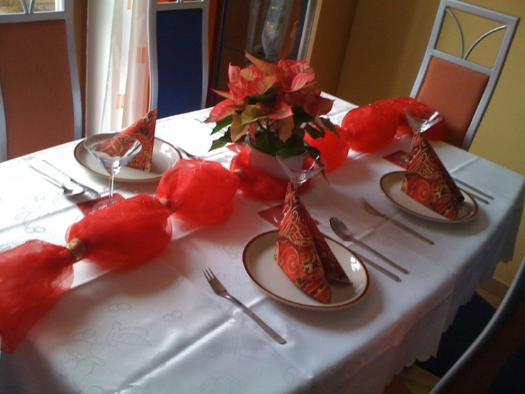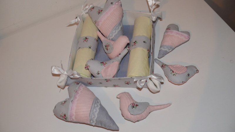 Já právě na prosírání a dekoraci pracuji...vše si dělám sama z látky která se nám líbí...zatím mám jen plátěný košíček na ubrousky, kriužky na ubrousky a rodinu dekoračních blbůstek, k tomu přibude prostírání (podložky pod talíře) ze stejné látky a podsedáky, bydlíme v garsonce tak vše musí být sladěné aby to působilo čistě .)