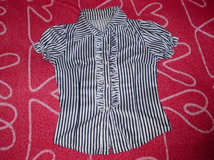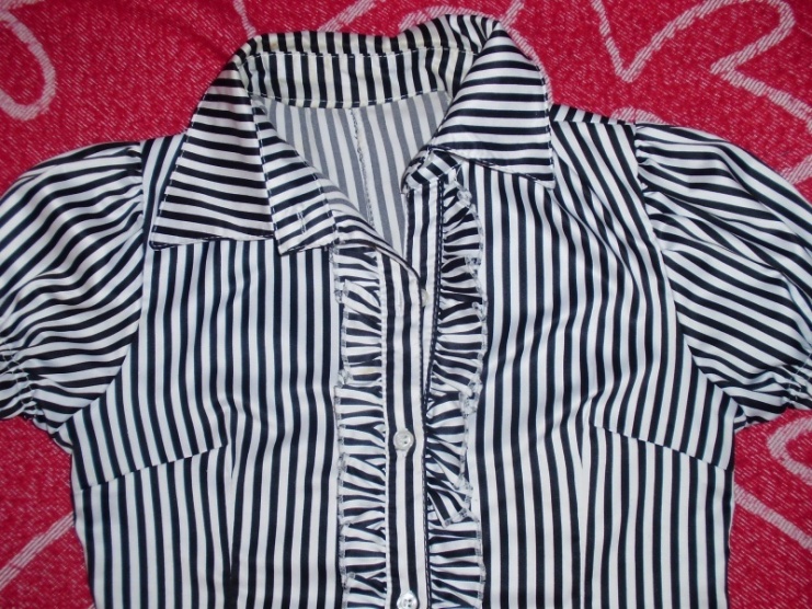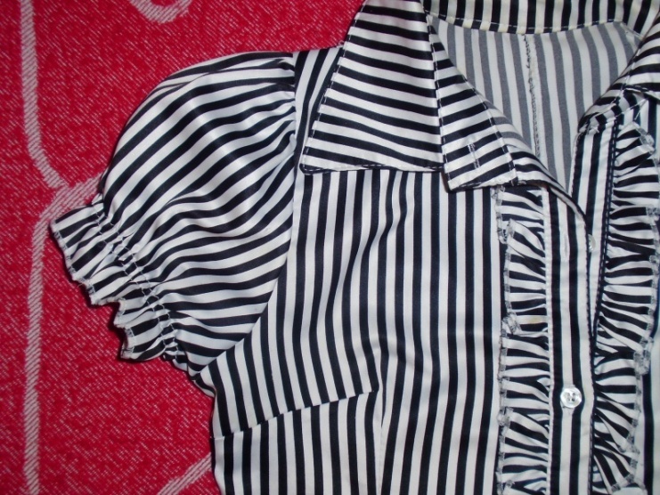 . Je zcela nová,nepoškozená. Košile je černobílá,má nařasené rukávky a volánky podél předního zapínání,velikost je S