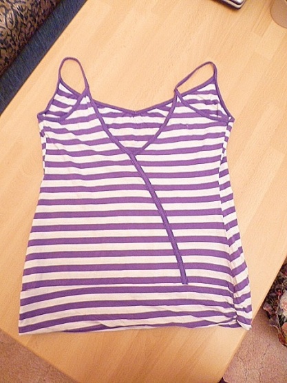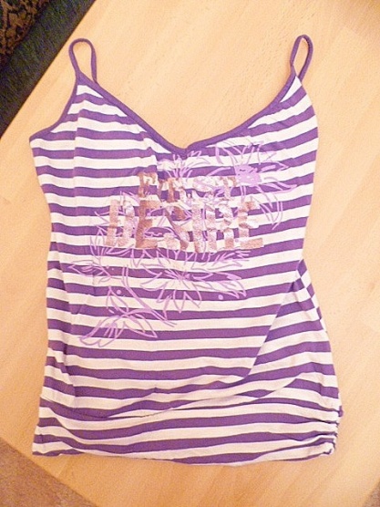 Prodávám hezké nošené tričko na ramínka značky Bershka. Krásná fialová barva s třpytivým potiskem. Vzadu zajímavý střih. Pevný spodní lem, na bocích dole nařasení. Velikost je uvedená L. Na požádání dodám míry. Prodám za 125 Kč + poštovné.
