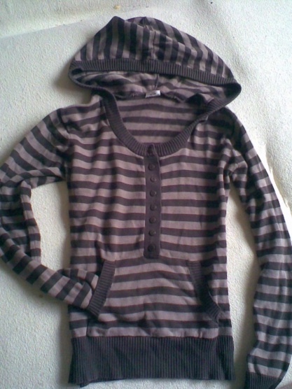 Svetr je skoro nenošený , bohužel velký , je přes hlavu , ozdobné knoflíčky , velký klokánek , Dlouhý rukáv, kapuce , materiál trochu pruží , Barva hnědá a béžová . Značka Amisu . velikost M-L cena je 100 kč