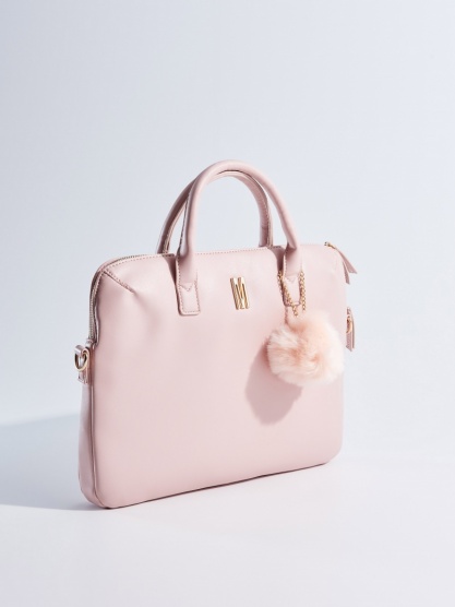 Nová krásná pudrově růžová taška na notebook lze nosit i jako taška do školy, zdobená bambulkou