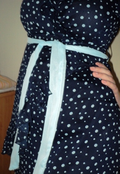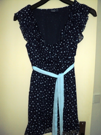Tmavě modrá barva, zdobená puntíky a světle modrou mašlí.