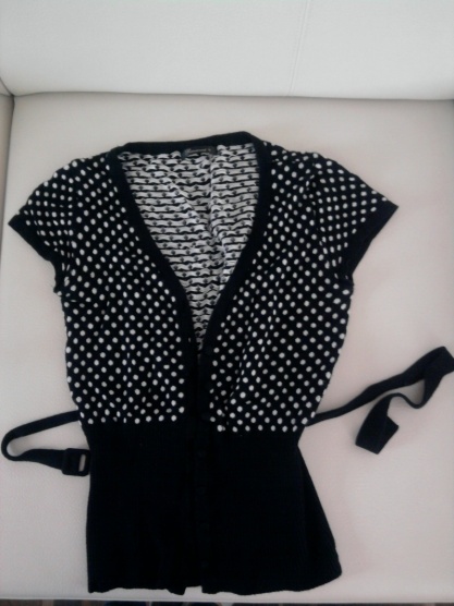 Sedí spíš na velikost S, minimálně nošený, zapínání na knoflíky. Je k němu i černý páseček, který se však dá oddělat