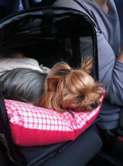 mám dnes už cca dvou roční slečnu. Začátek nošení v tašce si skoro nepamatuji, protože jako štěně zlobila, nechtěla tam být, tak jsem to nechala, po jejích 6 měsících jsem přišla, položila a jely jsme. Učila jsem ji na tašku do auta, aby byla hodna a my mohly spolu jezdit samy. První jízda proběhla vedle mně na místě spolujezde, uzavřená. Další jízdy pak vzadu na sedadle s otevřenou přední stěnou, aby mohla koukat. Malá se do ní tak zamilovala, že v ní leží i doma, asi tam má útulno. Přikládám fotky