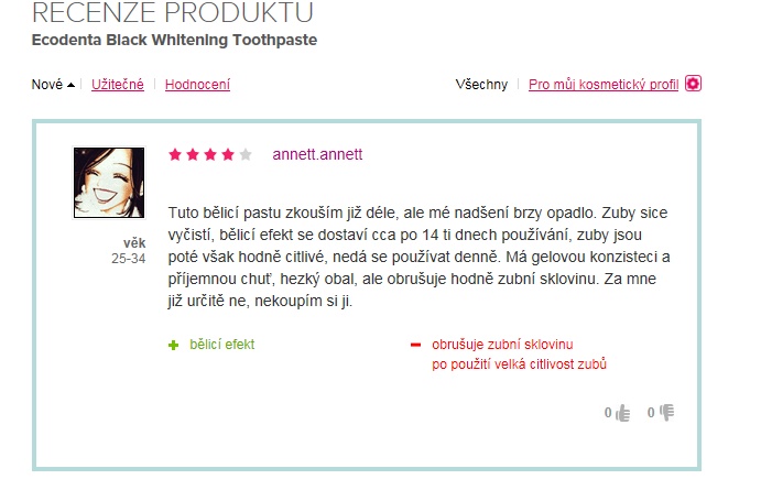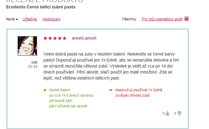 Pokud ne, přikládám pro připomenutí Vaši recenzi zmiňované zubní pasty, kterou jste psala před 1 nebo 2 dny, a text recenze na stejný výrobek, který jste napsala dnes. To se mi opravdu nezdá jako upřímně psaná recenze na výrobek, který skutečně používáte. A už vůbec nezmiňuji Vaše okopírované pasáže textů. Konkrétně u této pasty na zuby jsem se přesně stejné obraty dočetla v textu na heurece. U jiného produktu jste zase okopírovala text z popisu produktu z eshopu omlazení - což je další kapitola, produkty z eshopu omlazení. Svého času bývalo přidělováno za založení nové recenze na produkt ze zdejšího ehopu 60 bodů (což již, pokud vím, není) a bylo skutečně zajímavé vidět, že jste najednou náhodou měla zkušenost snad s polovinou sortimentu eshopu... Přiznám se, že dříve jsem nad Vašemi recenzemi občas přivírala oko (spíše obě dvě), což ale již nyní opravdu dělat nebudu.