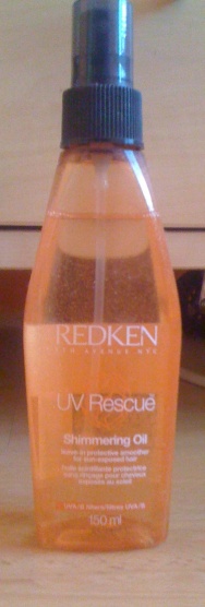 Redken Uv rescue shimmering oil - něco jako opalovací olej pro vlasy. Udržuje je na sluníčku v pěkné kondici, chrání před UV a vysušením. Je to běžná velikost 150ml a použito z ní bylo tak maximálně 30ml(spíš míň). PC: 700kč, teď za 270kč.