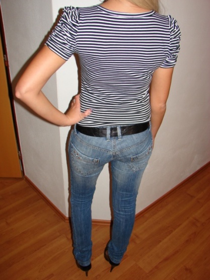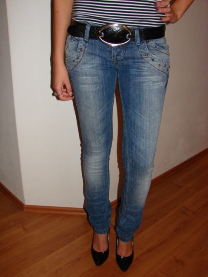 Krásné rifle ze zary, střih skinny, hodně úzké nohavice dole, nosí se nařasené. Pouze dvakrát nošené, jako nové. Snížené kapsy, barva středně modrá se šisováním, na pár místech efektně drhané, ozdobné cvočky. Velikost 36 odpovídá stejné velikosti riflí z obchodu bershka. Rozměry: šířka v pase 39-41cm, šířka přes boky 49-52cm, šířka přes stehno 25-28cm, přední sed 18cm, zadní sed 31,5cm, vnější délka 113cm, vnitřní délka 91cm, šířka nohavice dole 15cm. Rifle docela pruží. Více fotek pošlu mailem. Původní cena 1499Kč. Cena 799Kč. Poštovné 43Kč.