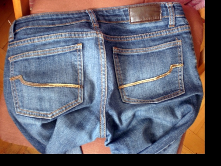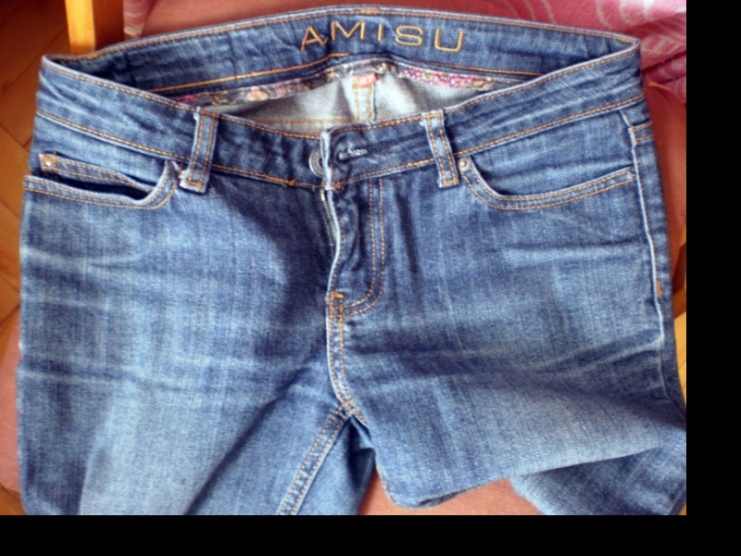 Prodám nošené rifle zn. Amisu, velikost 27, odpovídá S. Jsou tmavší barvy, origo šisované. Byly dost nošené, ale nohavice nejsou vůbec ošoupané, pouze je vyměněný nový zip. Na zadních kapsách jsou odřené kožené pásky, které zdobí kapsy (viz.foto), ale na nošení nemá vliv a není to znát, s delším topem vůbec ničemu nevadí.