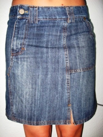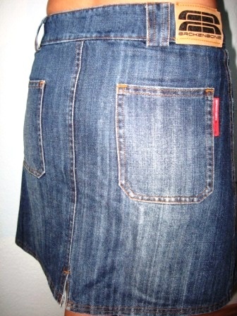 Krátká riflová sukně nad kolena Brokenbone se zapínáním na boku na zip a knoflík, pravá kapsa a vzadu dvě kapsy , na sukni je sice napsána velikost M, ale sedí spíše S/36.