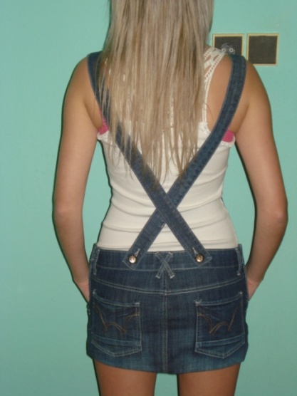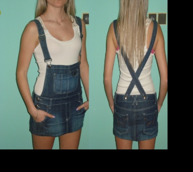 Prodám 1x vzatou džínovou sukní s laclem a kšandami.