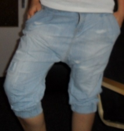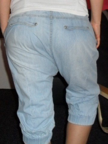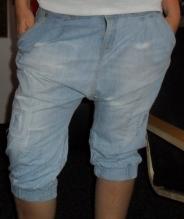 predám krásne riflové háremky velkosti 38 v predu mají dvě klasické kapsy a v zadu falošné kapsy.Kalhoty sú z velmi kvalitného a príjemného jeansu,so zapínaním na knoflíky a zipu ze předu.V podkoleni nohavice je všitá guma na regulovanie dĺžky.Na velmi peknej světlej riflovine vyniknú aj imidžové záplaty,ktoré im dodaju styl ..Kalhoty sú 2krát nošené bez akejkolvek vady.Rozmery volne položené kalhoty: