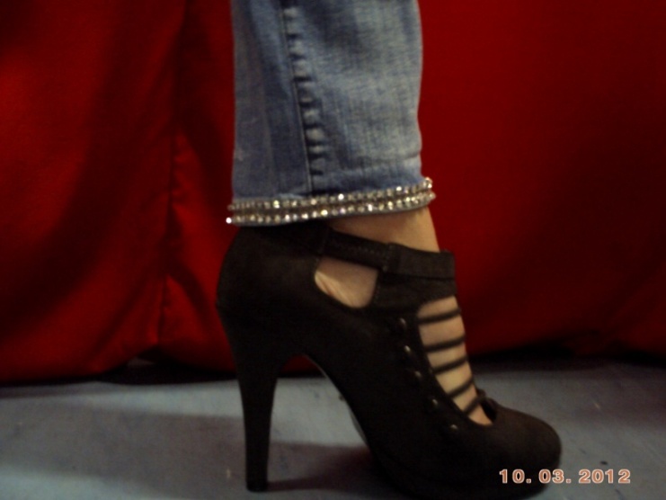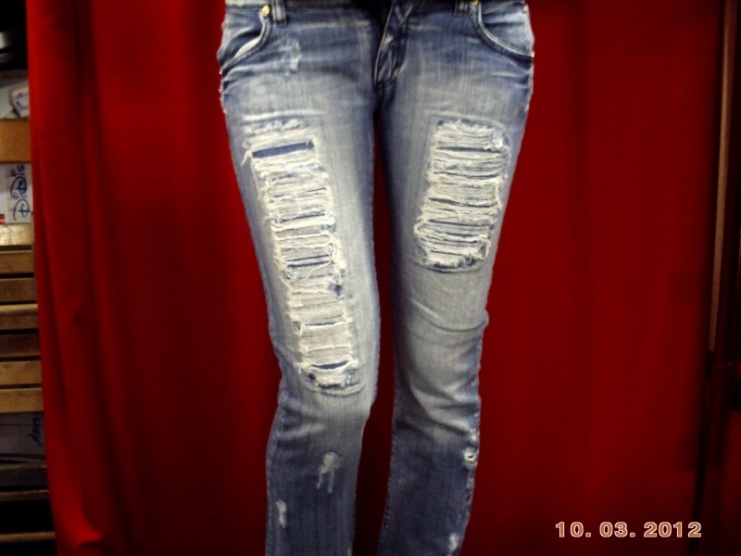Moderní kalhoty značky Met. Roztrhané na stehnech. Konce nohavic zdobeny kamínky.