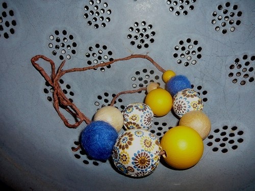 Ručně šité korálky z kvalitní zahraniční jemné 100% bavlny, plsťenky, přírodní dřevěné korálky, dřevěné akrylky - navlečené na hedvábné šňurce. Cena/ks.