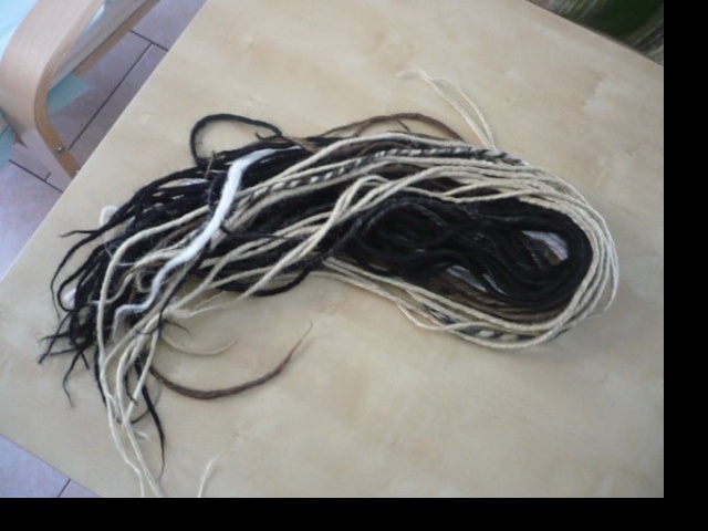 Prodám nošené pseudo dredy - kanekalon-double. Celkem 39 ks. Cena byla cca 800,- za materiál. Prodám za 500,- jsou v dobrém stavu!