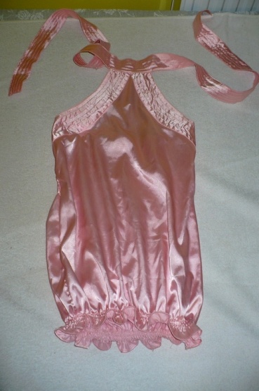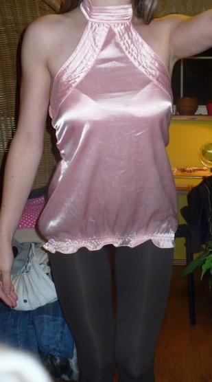 Lesklý, saténový materiál, zavazování za krkem.