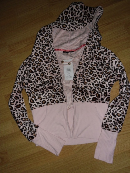 Nová, nenošená, ještě s cedulkou. Sametová mikinka ve světle růžové barvě s leopardím motivem a kapucou. U zipu je pouze třeba nasadit jezdec. Velikost uvedena M, ale pasne S i M. Moc příjemný materiál.