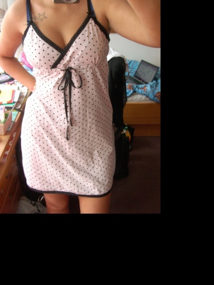 Prodám noční košilku růžové barvy s černými puntíky. Košilka má nastavitelná ramínka a dá se utáhnout pod prsy. Je lemovaná černou krajku. Košilka je z 93% bavlněná a ze 7% je použit elaten. Velmi příjemný materiál na spaní. Velikost je uvedena 38/40, ale spíše odpovídá 40/42.