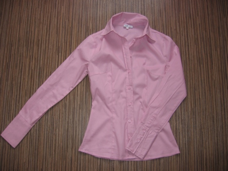 Světle růžová barva, zapínání na knoflíky až ke krku.