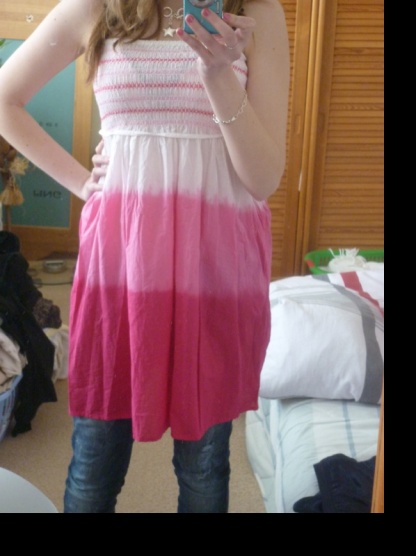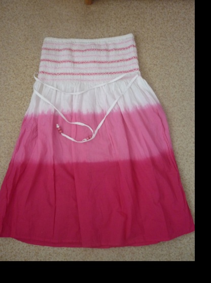 Prodám tuto tuniku s přechodem od bílé-sv.růžové až po normální růžovou. Není nikdy nošená. Velikost uvedena 36/38, doporučuji na M. Vzadu se zavazuje na mašličku. Na šňůrkách jsou korálky. Nechám za 130Kč i s poštovným.