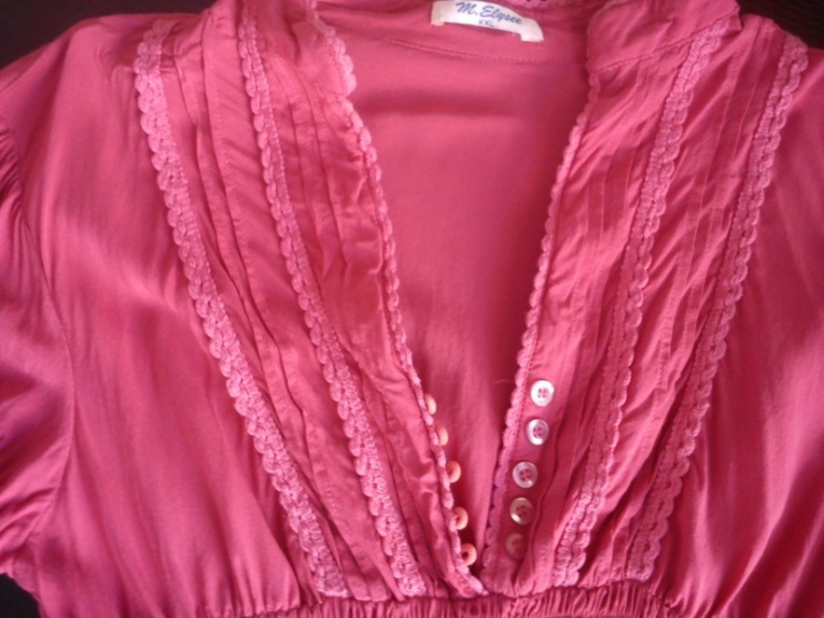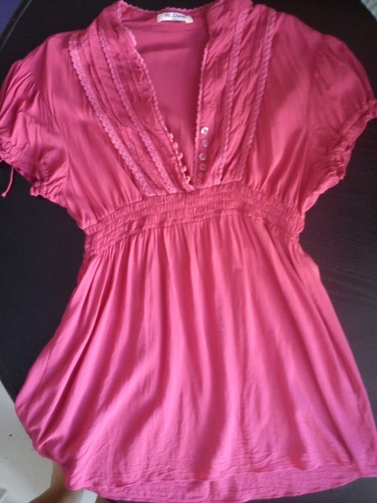 0lehounká tunička ve předu se zdobením stažená gumou v pase,ve výsřihu má knoflíčky a rukavy se šněrováním,které se dají libovolně utáhnout
