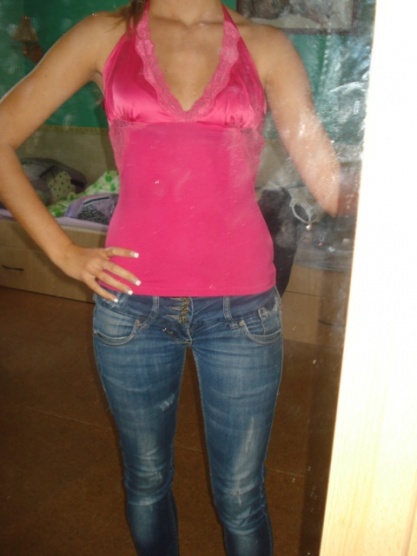 Nabízím sytě růžové tílko s krajkou okolo výstřihu a na zádech. Dělá hezký výstřih.Je na zavazování za krk.Velikost SCena:150 + 40 pošta