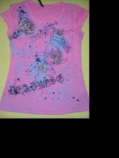 Růžové triko s aplikací, nošené, ale pěkné. Velikost padne i L. Cena 120,- vč. pošty.