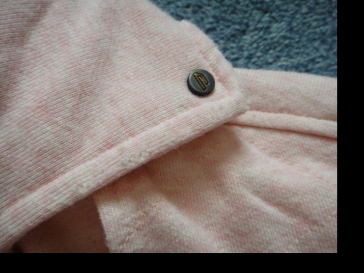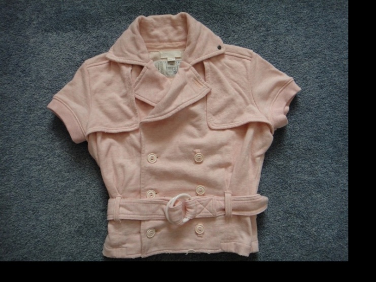 Triko je růžové barvy s dvouřadým zapínáním s límečkem.