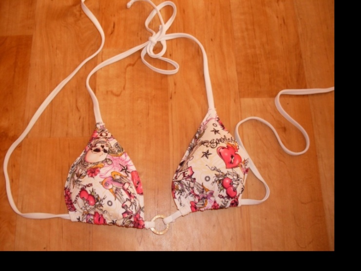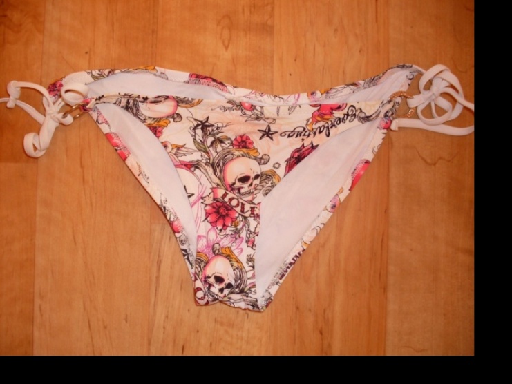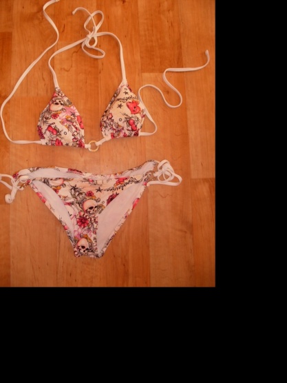 Prodám málo nošené růžovobílé bikiny s lebkami, kytičkami a stříbrným prachem z NY.