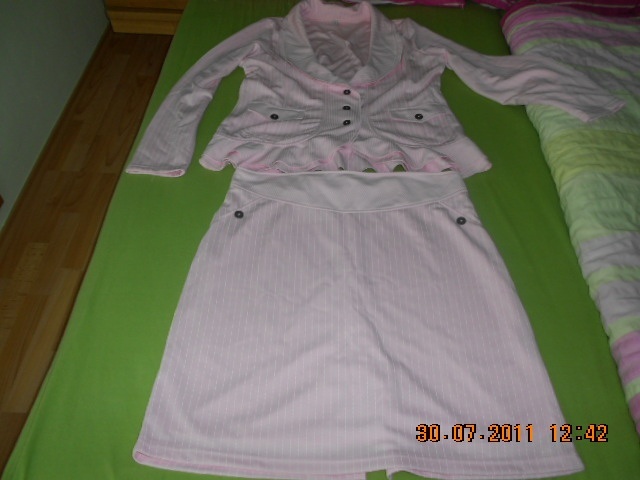 0Krásný růžový kostýmek s jemným bílým proužkem, lehce pružný materiál! Velice zajímavé a pěkně střižené sáčko. Byl nošený minimálně, velikost je 48!