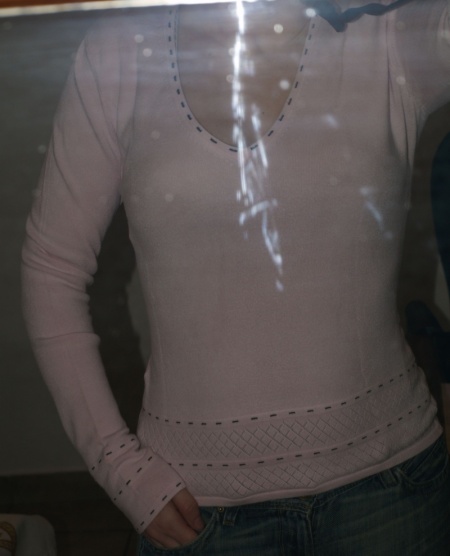 Krásný růžový svetřík zn. Comtesa, výstřih do V, kolem výstříhu, rukávů a dolního okraje svetru černé štepování. PC 1650Kc. Minimálně nošený. Velikost S i menší M