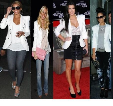 Jak se tak dívám na ty fotky, tak více méně platí bílé sako plus bílé triko nebo halenka. Ta černo bílá kombinace Beyonce se mi moc nelíbí....