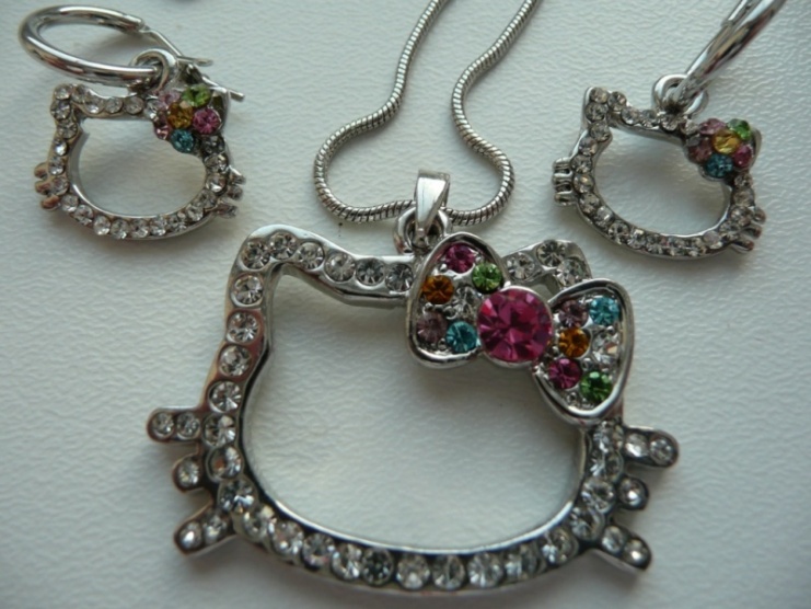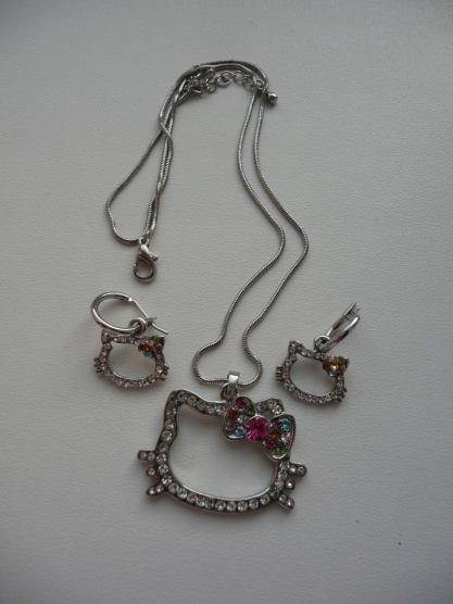 Prodám sadu náhrdelníku a náušnic s kočkou, materál rhodiovany kov, swarovski komponenty. Náušnice 2,5 x 1cm, náhrdelník 3x2cm, délka 37-44cm. Nové, nevhodný dárek.