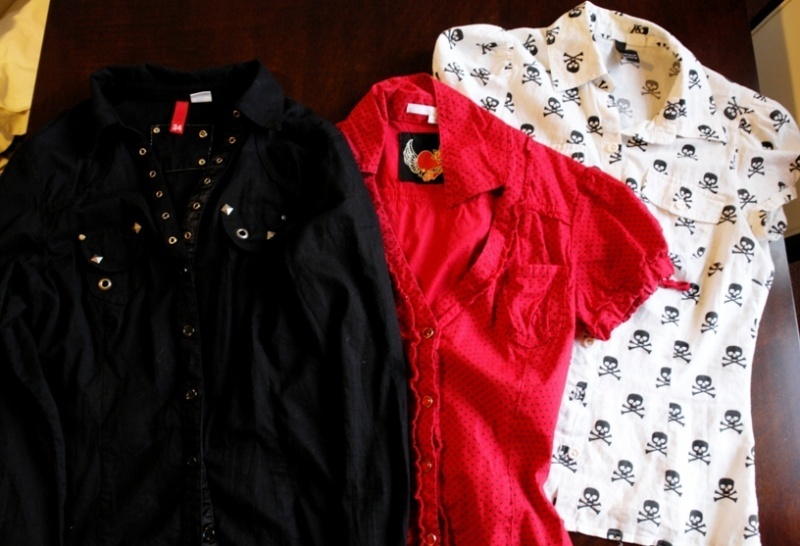 Prodám tyto 3 košile dohromady. Zleva černá HM s dlouhými rukávy, kapsy zdobené kov.pyramidkami vel. 34,červená s černými puntíky Tally Weijl retro střih, vel. 34, nabírané rukávky, a HM Divided bílá s lebkami, nabírané rukávky, vel. 34. Málo nošené. Mám moc oblečení. Prodám všechny 3 za 300 Kč. Nejlépe osobní předání Praha. Pište do SZ