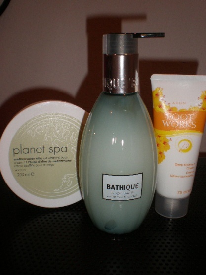 Sada nových, neotevřených výrobků. Krém na tělo s pumpičkou značky Bathique (Douglas) bílý čaj a zázvor 300ml, tělový krém s olivovým olejem Planet spa Avon 200ml, vysoce hydratační krém na nohy Avon 75ml.