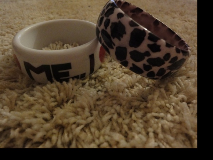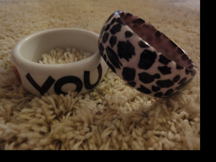 Prodám dva krásné, nové, plastové náramky. Jeden s nápisem: I love you, you love me(bílý s červeným a černým potiskem) Druhý se zvířecím vzorem(bíločerný) Cena za oba 90 kč plus pošta