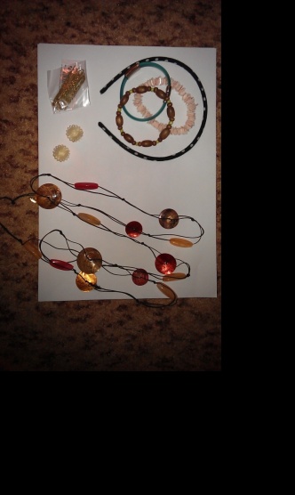 Náramky: jeden je od moře - ten růžovej, jsou to takový ty ostrý kousky, jestli to znáte. Ten hnědej je dřevěnej s malýma zelenýma korálkama... Kdyžtak se ptejte dál.