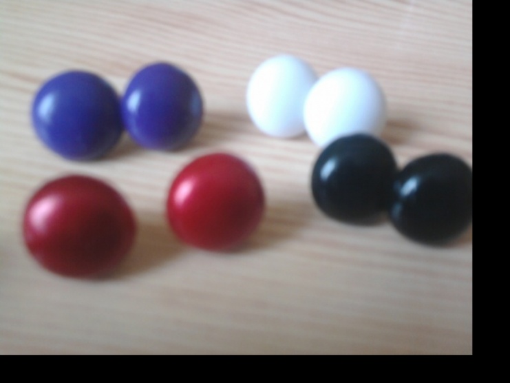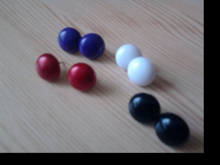 fialové(sytě fialové fotka klame) červené(původně růžové přelakované,nejde vidět),bílé a čern náušnice