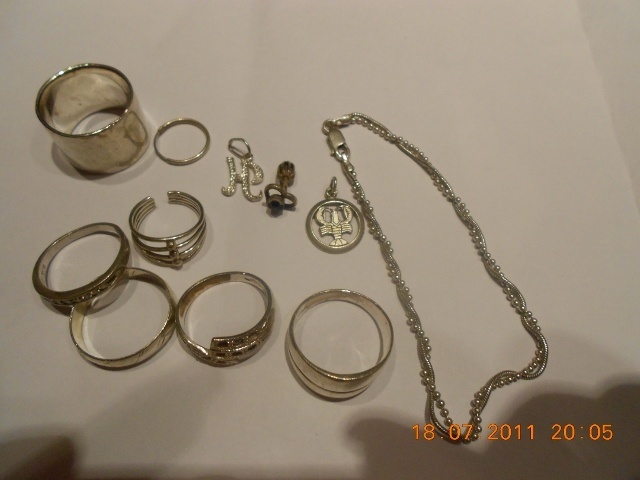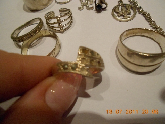 Nabízím stříbrné šperky...stříbro už víc jak 8 let nenosím a jen mi to tu zbytečně leží..třeba někdo ještě využije..je potřeba je vyčistit....jsou tam prstýnky, řetízek na ruku, přívěšek se znamením raka, přívěšek písmeno H, jedna stříbrná náušnice ve tvaru srdíčka s modrým kamínkem a jedna stříbrná náušnice malý kruh! V jednom prstýnku (špička), chybí některé kamínky....Cena za vše je 399,- vč pošty...