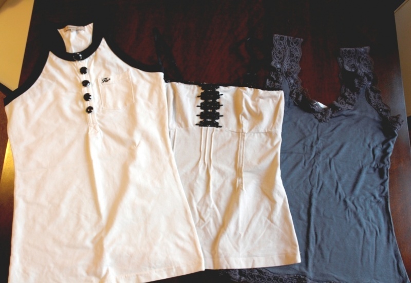 Prodám tyto 3 tílka..zleva Reserved krémové s černými knoflíky vel. XS (ale je spíš S), Mango krémové, tenká ramínka, černé zdobení vel S, tmavě modré s krajkou Promod vel. S.