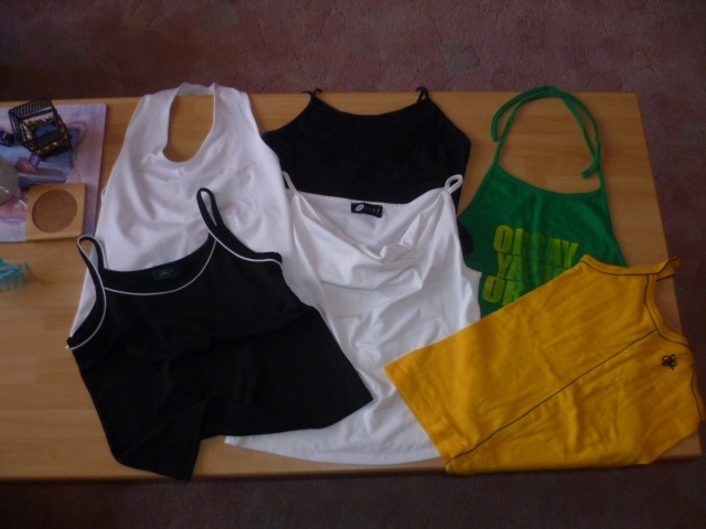 Prodávám 6 nošených topů. Dva bílé a zelený jsou z Orsay, černý nahoře zakoupený v Makru, žlutý a druhý černý zřejmě beze značky. Topy jsou spíše menší, tak na velikost XS, S.. možná na menší M. Cena i s poštou je 100 Kč.
