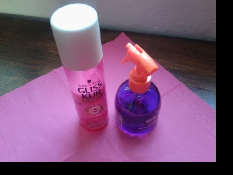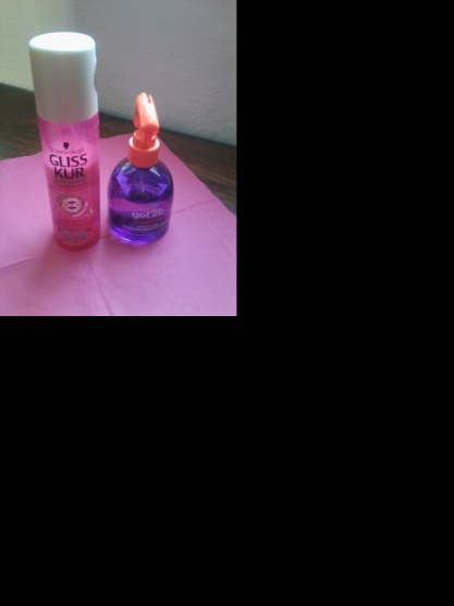 Sada obsahuje přípravek Got 2 be, vhodný jako ochrana pod žehličku, zároveň má vlasy narovnávat, je dvakrát použitý. Druhým přípravkem je Gliss kur, regenerační kůra na vlasy po umytí proti lámání. Je ani ne do půlky vystříkaný.