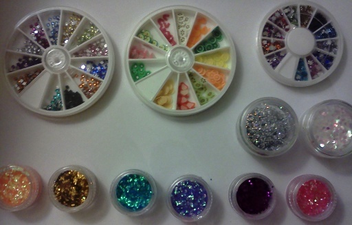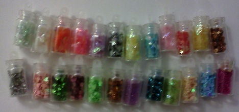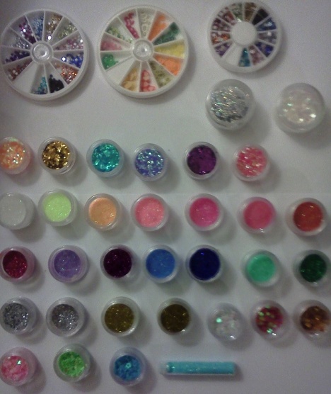 Glitrový prach - světle modrá, stříbrná (2x), fialová (3x), bílá, zlatá (2x), růžová (3x), modrá (3x), zelená (2x), oranžová, žlutá, červená.