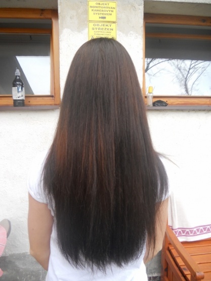 Jinak pokud ještě můžu doporučit...Nic mi nepomohlo tak,jako henna Lush. Používala jsem ji minulý rok asi 2 měsíce během kterých jsem 4x aplikovala. Vlasy neskutečně pevné,fakt koňské žíně,rychle se mi ale vymývala tak jsem toho nechala, protože bych se nedoplatila kdybych jí furt kupovala. No a teď nedávno koukám na své fotky vlasů a nestačím se divit,co mi s nimi udělala během těch dvou měsíců-místo narostlých 2cm mi jich narostlo tak 5-6,viz fotka. Jediné - že mám hodně červeného pigmentu takže mi šla dost do tepla což nesnáším,vyřešila jsem to ale tmavo hnědým přelivem (už ho mám na té 2.fotce) co ty červené tóny překryl.