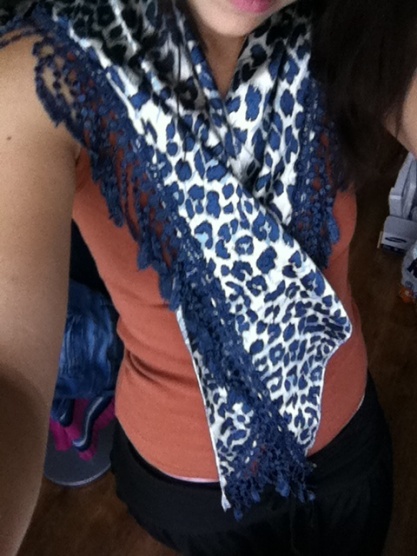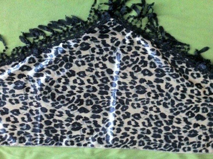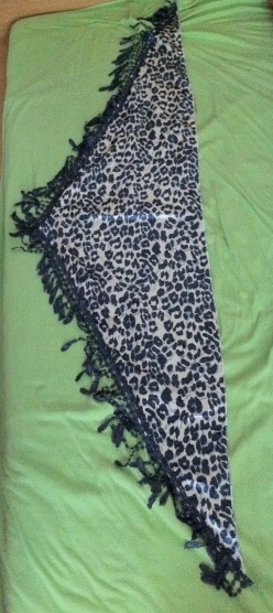 0Prodám lesklý šátek smetanové barvy s modrým leopardím potiskem, na okrajích má ozdobné třásně, výborný stav ,vůbec nenošený