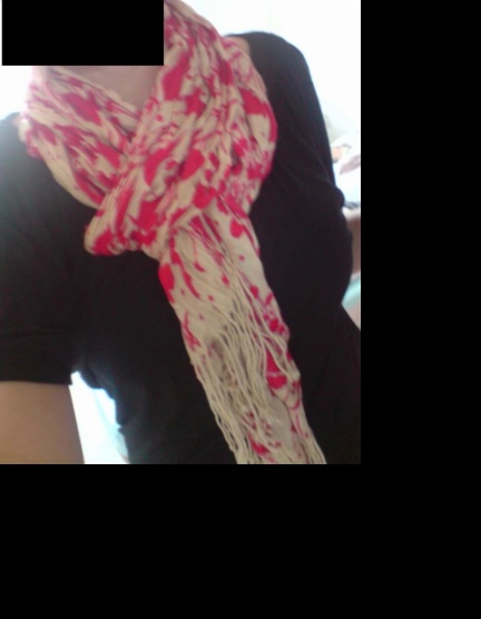 Červeno béžový šátek, mačkavý materiál, motivy velké květy, nenošený - špatný dárek, cena 120,- Kč včetně pošty.