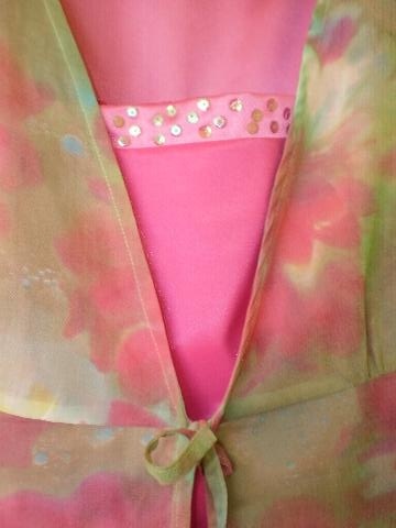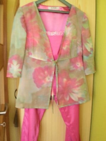Saténový komplet, kalhoty + topík (malinová barva s flitry), s průhlednou projmutou halenkou zelenomalinové barvy, pod prsama lze uvázat, moc krásný. Nový. Velikost L, cena 900,- + pošta