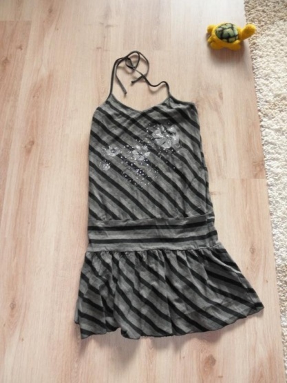 Krásné pohodlné letní šaty zavazování za krkem černo- šedý proužek zakoupené v QUELLE mají krásnou aplikaci zdobenou kamínky ani jeden nechybí jsou jen zkoušené nenošené takže top stav! vel. 38 pružný materiál míry jsou....