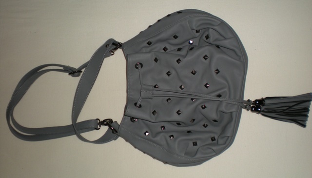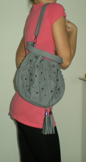 Nikdy nošená kabelka ve tvaru vaku, stahuje se šnůrkou, je tam ovšem i cvoček. Má dvě ucha, kratší do ruky, druhé se dá prodloužit a možno nosit jako crossbody, na fotce je zkrácené. Pěkné detaily pyramidek a střapců. Cena 330 vč. pošty., protože balíček bude těžší.