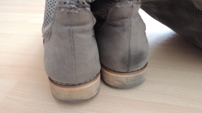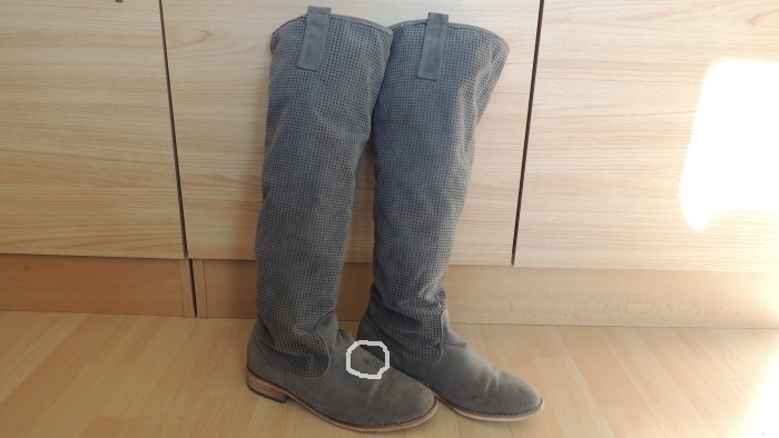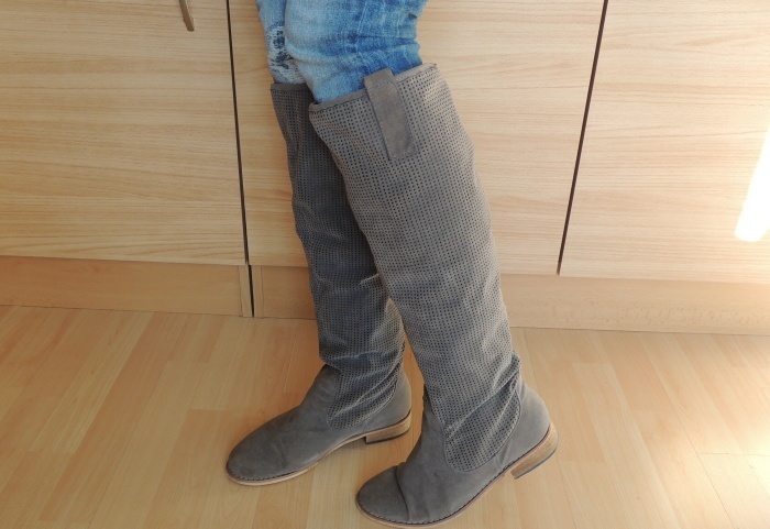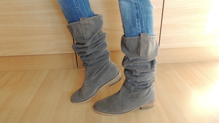 Letní děrované šedé kozačky, nošené minulé léto. PC 1900,- Prodávám za nižší cenu protože mají odřenou patu (to se dá myslím v obuvi nechat upravit) a menší flíček vpředu, viz. foto. Dají se nosit na dva způsoby buď ohrnuté nebo na pevno.