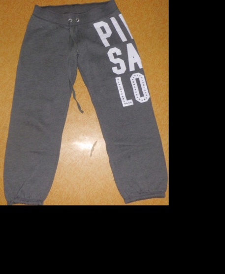 Velký nápis Pink says love na levém boku nohy.Ze slova love odpadly kamínky,voz foto.Na nošení nemá vliv.V pase stažení šňůrkou.Dole nohavice staženy gumou.V dobrém stavu,místy pár žmolků.